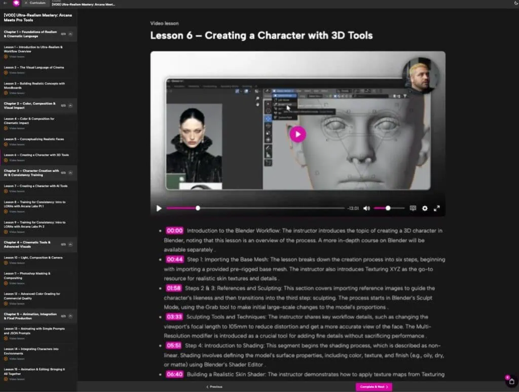 Bonus : By purchasing the VOD and the Live Course, you’ll also get a 1h40m timelapse of my full workflow — sculpting, grooming, and development look of a 3D character, shown step-by-step on screen without cuts or narration.
